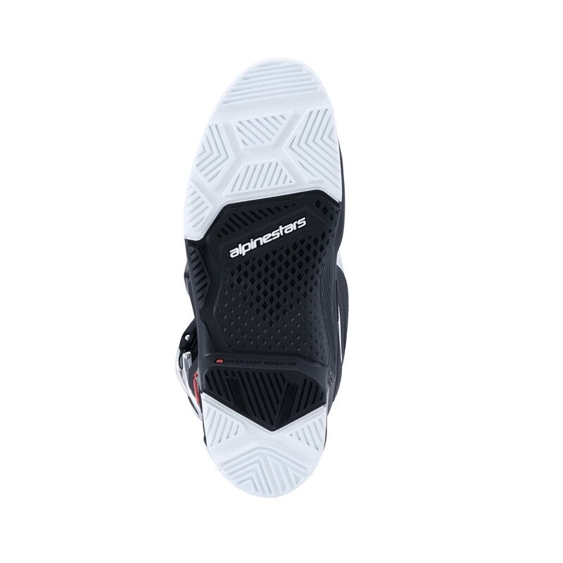 - הסוליה עשויה עם מחוון מגבלת שחיקה חדשני המוטבע באזור יתד כף הרגל. שכבה זו מציגה שכבה אדומה המתריעה לרוכב כאשר הסוליה בלויה וצריכה החלפה.